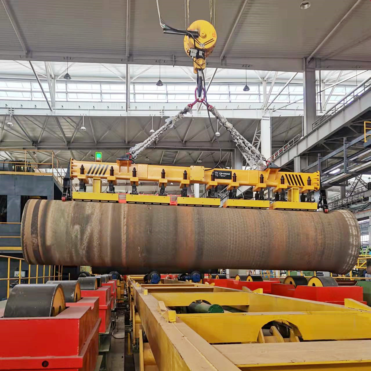 千豪電永磁吊具在吊鋼板,鋼管,鑄管等導磁工件上取得廣大顧客的認可與返購。使用電永磁吊具吊裝鋼管及鑄管圓形導磁工件,只需要吸附一部分接觸面即可吸吊起8噸、10噸、16噸,32噸.