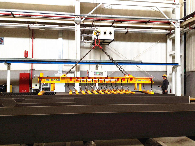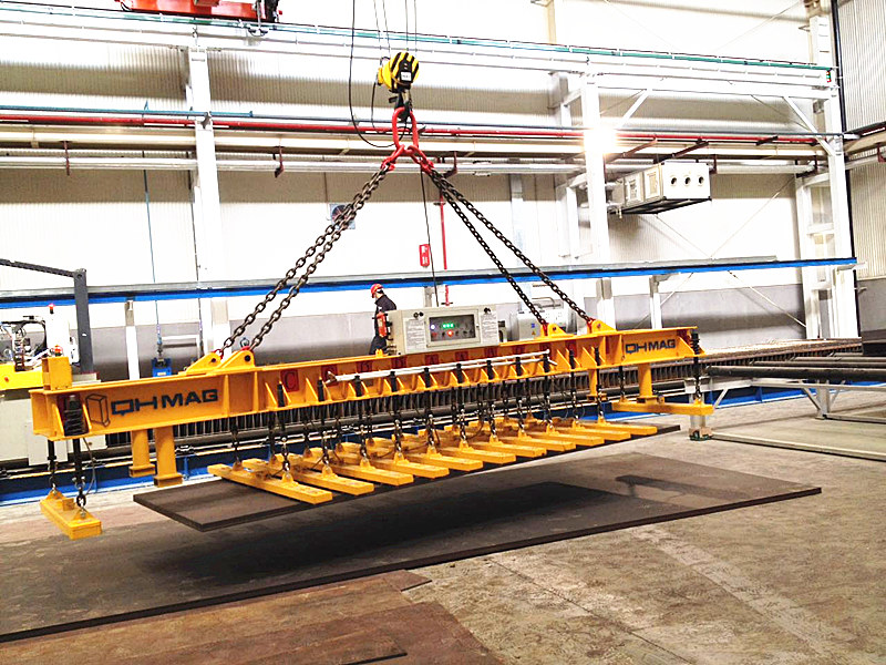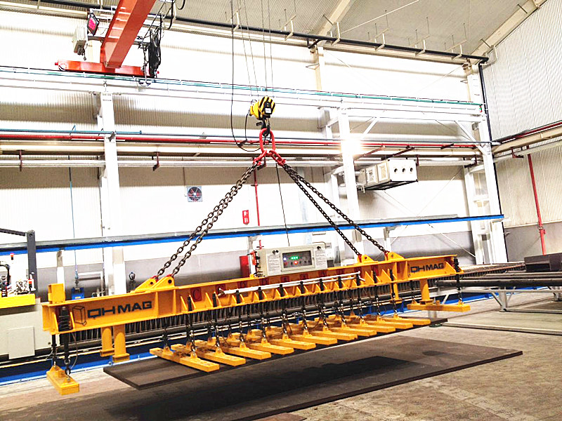 湖南千豪鋼板上下料切割線用電永磁吊具屬于鋼板吊具的一種:鋼板切割線(火焰切割、等離子切割、激光切割等)的上下料,通常要求上料時只吊運一張整板,切割完后,所有切割工件一次性或盡量多的從切割臺上吊運下來,針對這一要求,千豪磁電研發(fā)了矩陣式和密布式電永磁吊具系統(tǒng)。
