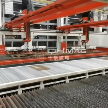 工業(yè)桁架機器人的應用使工人在規(guī)?;a過程中擺脫了單調重復的體力勞動,改善了工作環(huán)境,同時提高了產品質量,因此成為了企業(yè)自動化改造的必然選擇。桁架式工業(yè)機器人以其高可靠性、高速度、大負載、大行程、低成本等特點,在物料搬運傳輸領域有著獨特的優(yōu)勢,應用前景十分廣闊。傳統(tǒng)鋼結構車間采用激光切割機切割鋼板,鋼板以人工分揀為主,工人勞動強度大,生產效率低,工作環(huán)境惡劣。因此千豪為鋼板自動化分揀機器人安裝電永磁鐵,用于代替人工實現(xiàn)鋼板的自動分揀