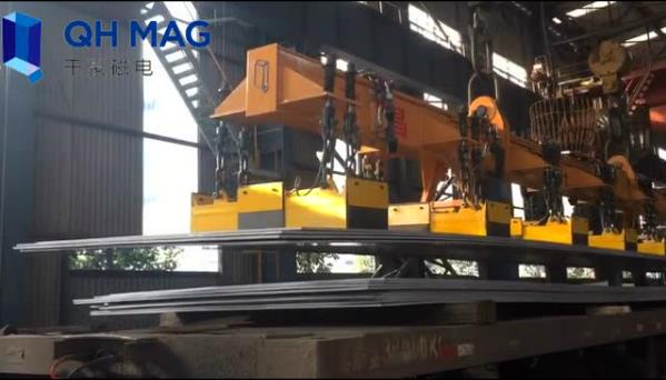 中厚板多張起吊可以采用電永磁吊具,湖南千豪可根據(jù)客戶需求定制解決方案,其產(chǎn)品設(shè)計具有調(diào)磁功能,吸料時調(diào)節(jié)電壓即可滿足單張多張切換起吊。吸吊鋼板時,采用調(diào)磁保磁控制設(shè)備;在起重電磁鐵所吊物料運行至指定位置過程中,如遇電網(wǎng)停電或主整流部分故障;或人為關(guān)掉電源,備用電源立即自動投入,以保證被吸物料不致落下;以防砸壞設(shè)備、傷及人員等發(fā)生安全事故。