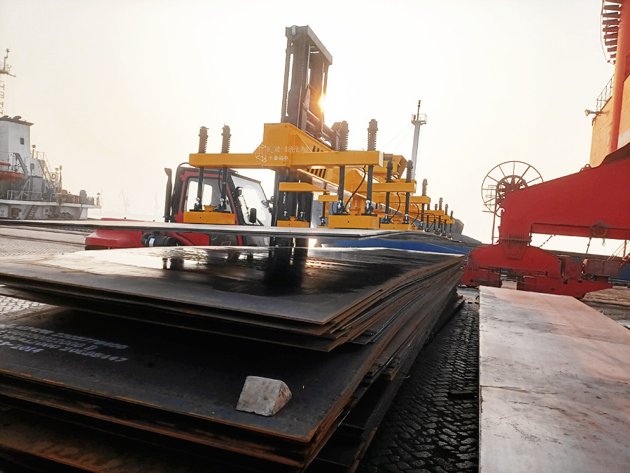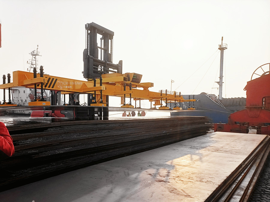 此款磁力吊具用在港口配合叉車使用吊運長鋼板。本套充電式鋼板起重吊具采用12組電永磁起重器聯(lián)吊。可實現(xiàn)單張鋼板max重量為4噸、厚度8mm、10mm、12mm鋼板一次搬運二張平穩(wěn)運行。厚度14mm、16mm鋼板一次搬運一張平穩(wěn)運行。