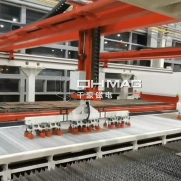 工業(yè)桁架機(jī)器人的應(yīng)用使工人在規(guī)模化生產(chǎn)過程中擺脫了單調(diào)重復(fù)的體力勞動,改善了工作環(huán)境,同時提高了產(chǎn)品質(zhì)量,因此成為了企業(yè)自動化改造的必然選擇。桁架式工業(yè)機(jī)器人以其高可靠性、高速度、大負(fù)載、大行程、低成本等特點(diǎn),在物料搬運(yùn)傳輸領(lǐng)域有著獨(dú)特的優(yōu)勢,應(yīng)用前景十分廣闊。傳統(tǒng)鋼結(jié)構(gòu)車間采用激光切割機(jī)切割鋼板,鋼板以人工分揀為主,工人勞動強(qiáng)度大,生產(chǎn)效率低,工作環(huán)境惡劣。因此千豪為鋼板自動化分揀機(jī)器人安裝電永磁鐵,用于代替人工實(shí)現(xiàn)鋼板的自動分揀