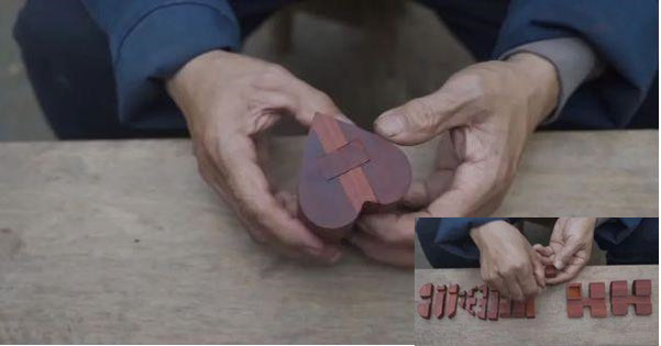 這個心型戒指盒,把戒指藏在最里面,六道魯班鎖就成了層層機關的保險,沒點技術,還真的打不開。